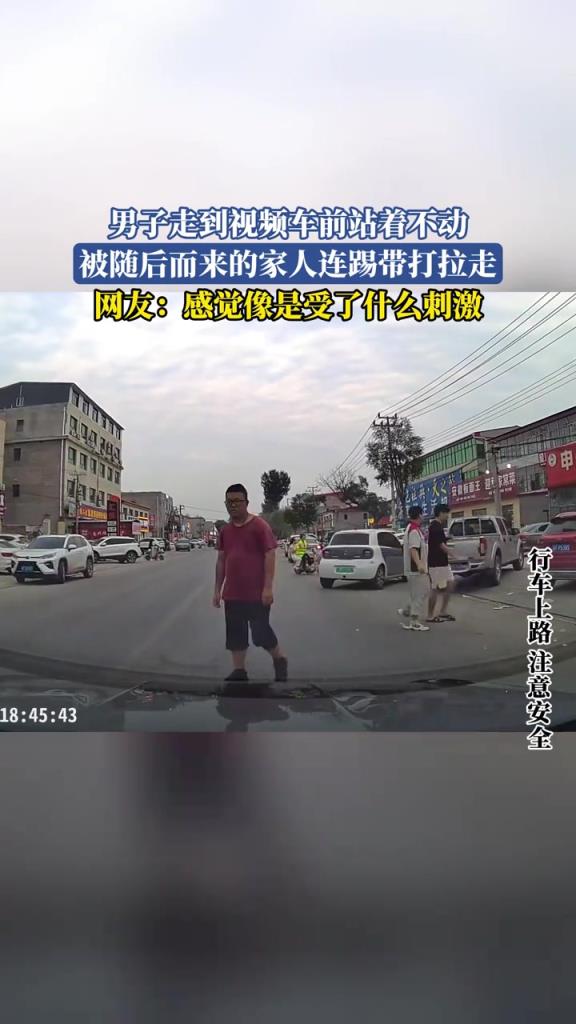 男子走到视频车前站着不动,被随后而来的家人连踢带打拉走