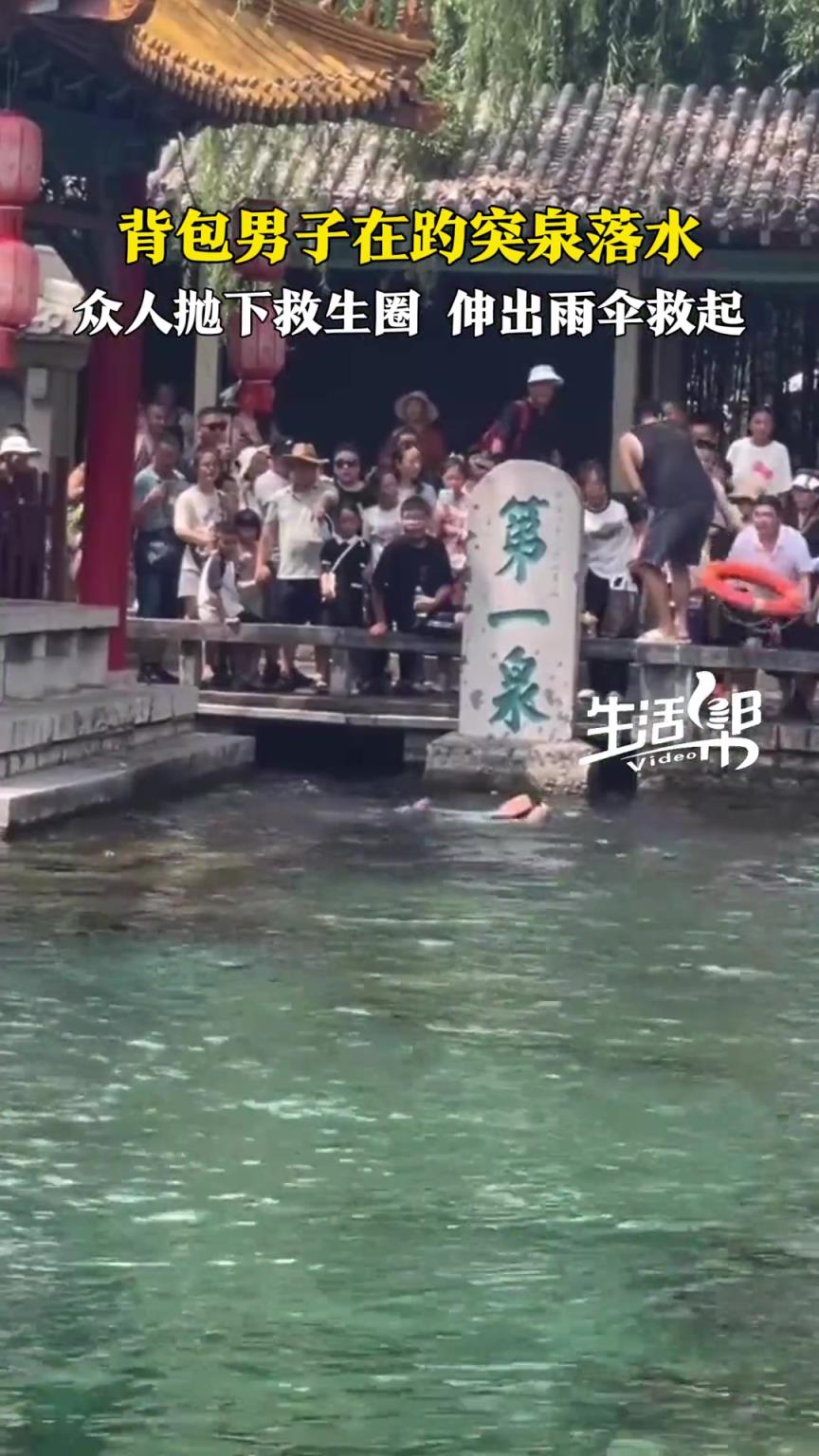 背包男子在趵突泉落水,岸上众人抛救生圈、伸出雨伞把人救上岸
