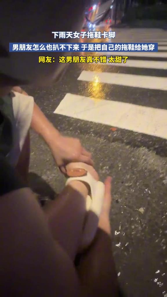 下雨天女子拖鞋卡脚,男朋友扒不下来,于是把自己的拖鞋给她穿!