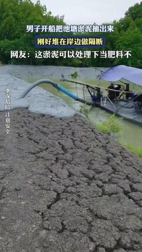 男子开船把池塘淤泥抽出来,刚好堆在岸边做隔断。