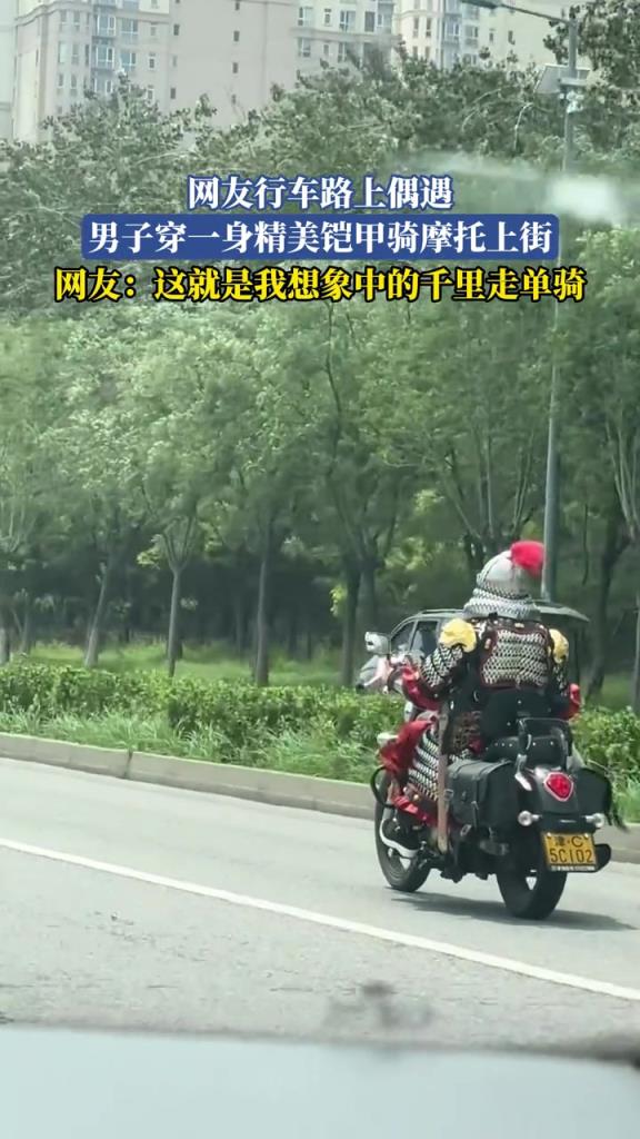 网友行车路上偶遇,男子穿一身精美铠甲骑摩托上街