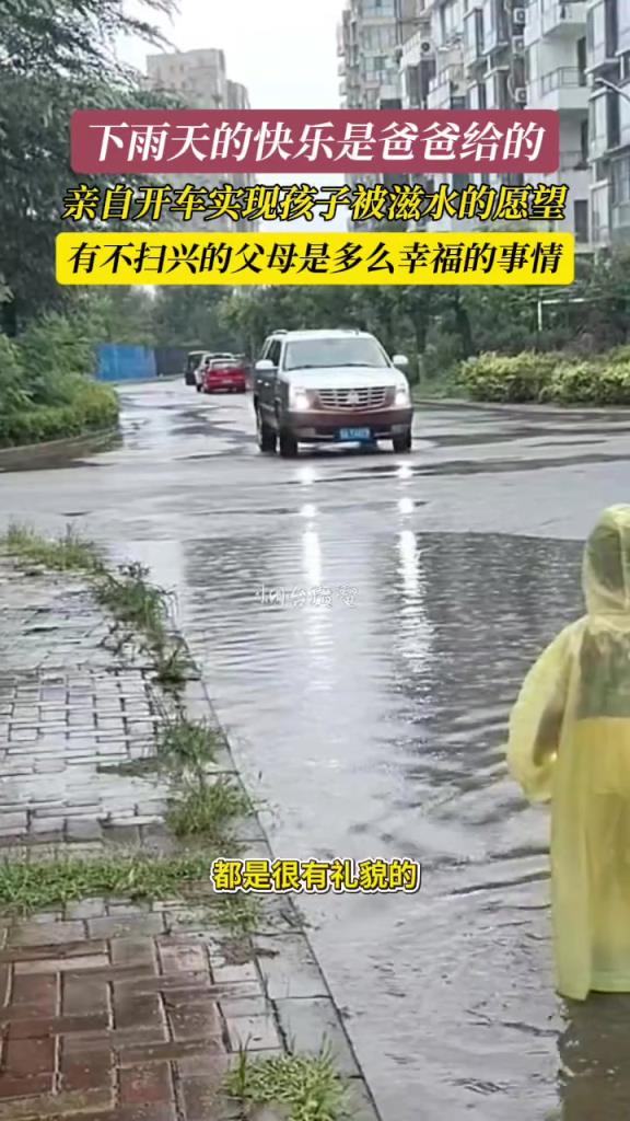 下雨天的快乐是爸爸给的,亲自开车实现孩子被滋水的愿望。
