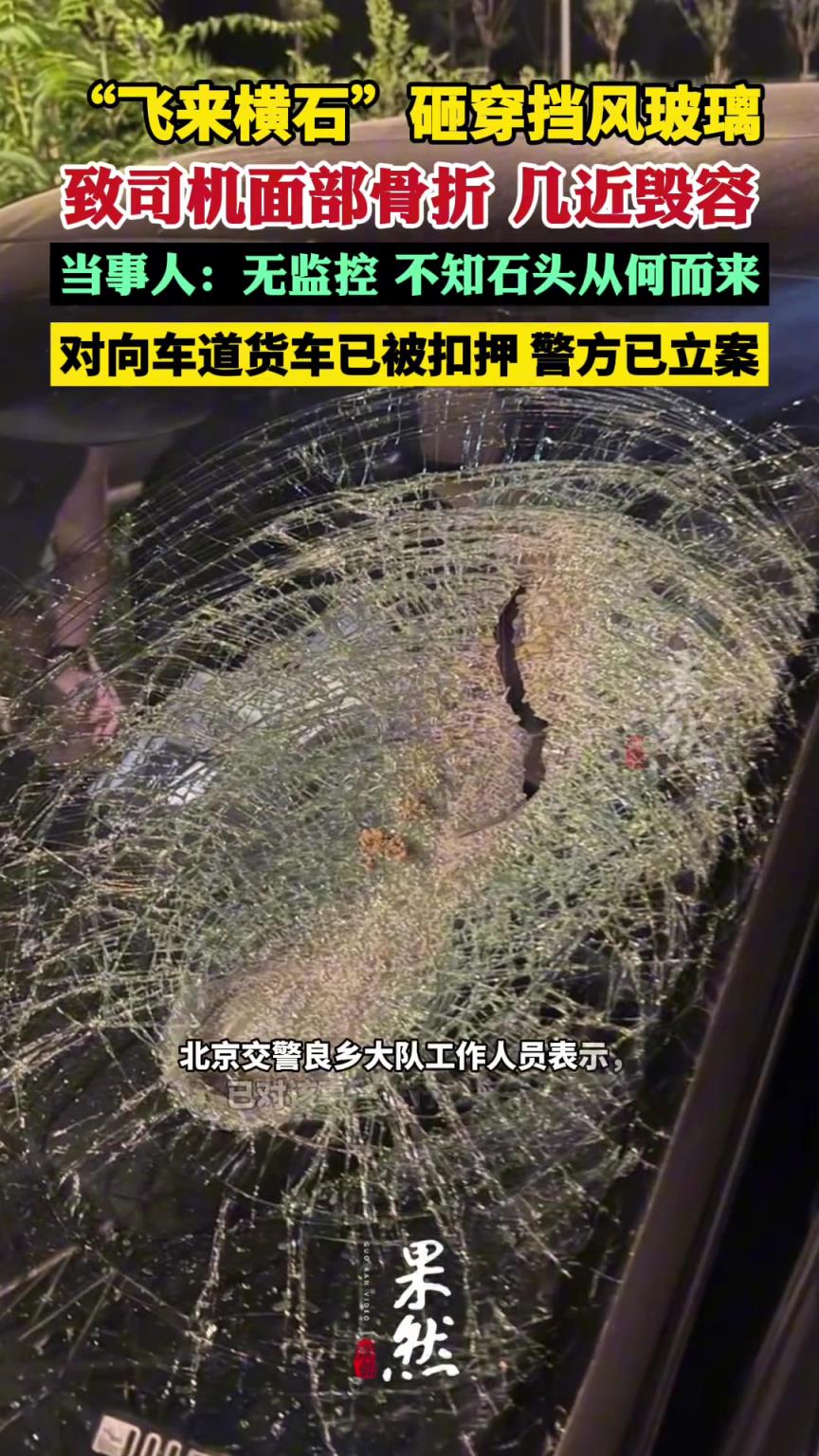 “飞来横石”砸穿挡风玻璃致司机面部骨折
