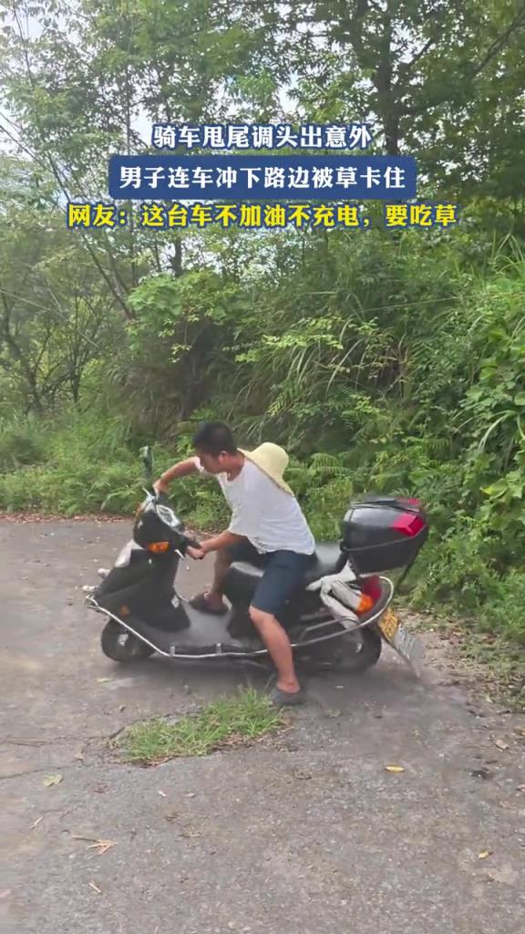 骑车甩尾掉头出意外,男子连车冲下路边被草卡住!!