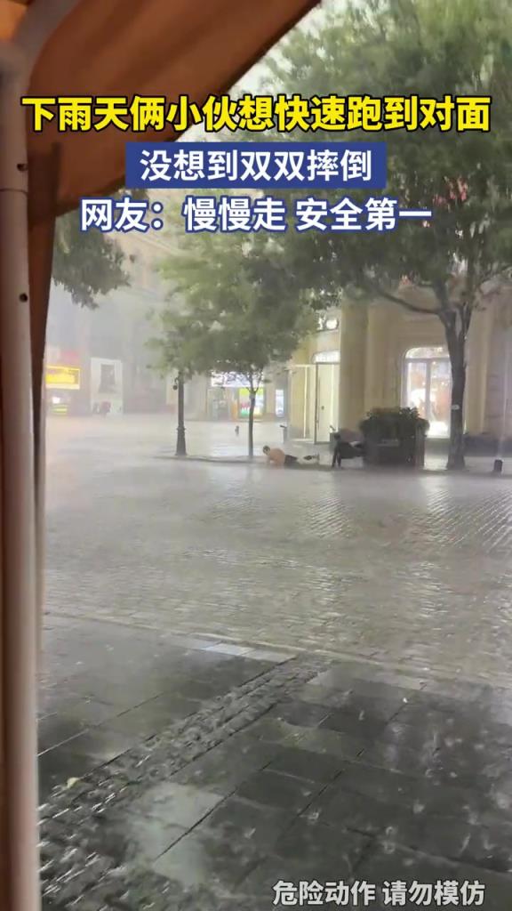 下雨天俩小伙想快速跑到对面,没想到双双摔倒!!