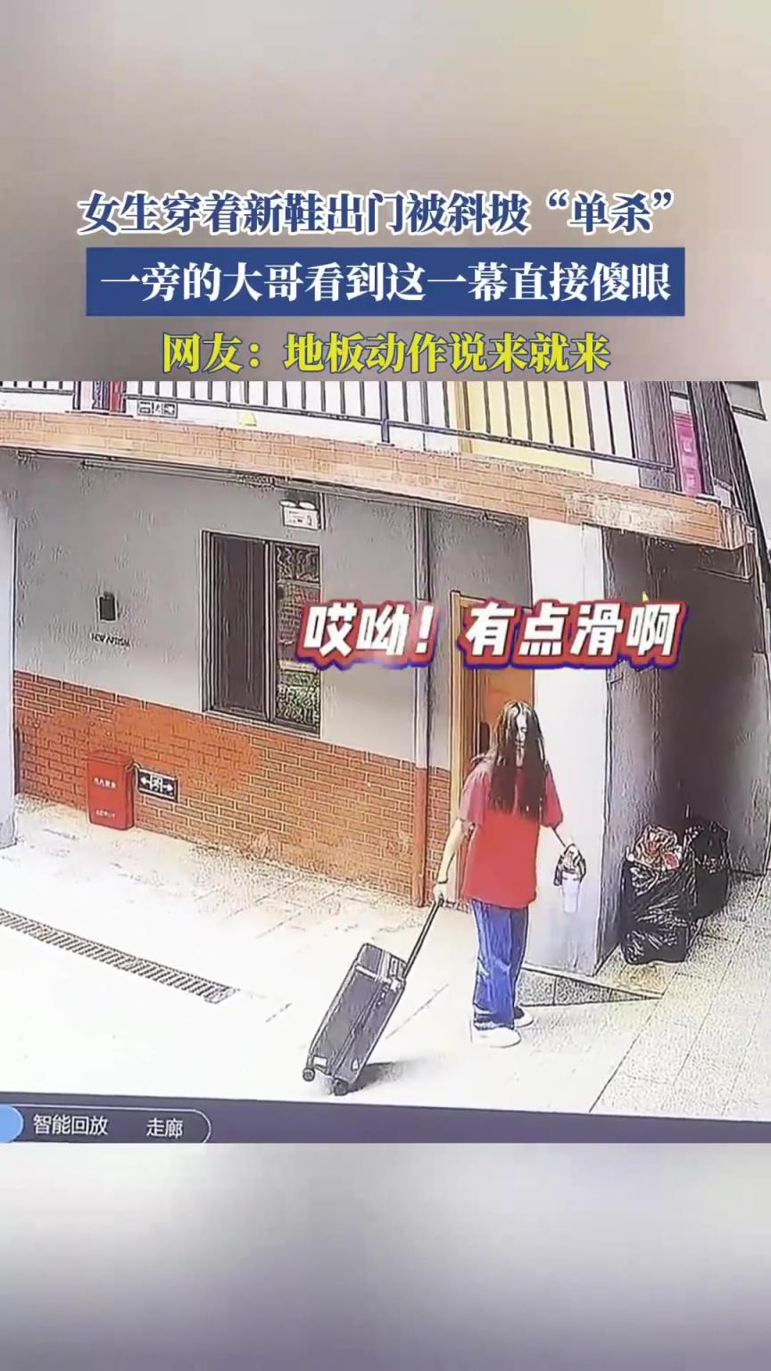 女生穿着新鞋出门被斜坡“单杀”,一旁的大哥看到这一幕直接傻眼