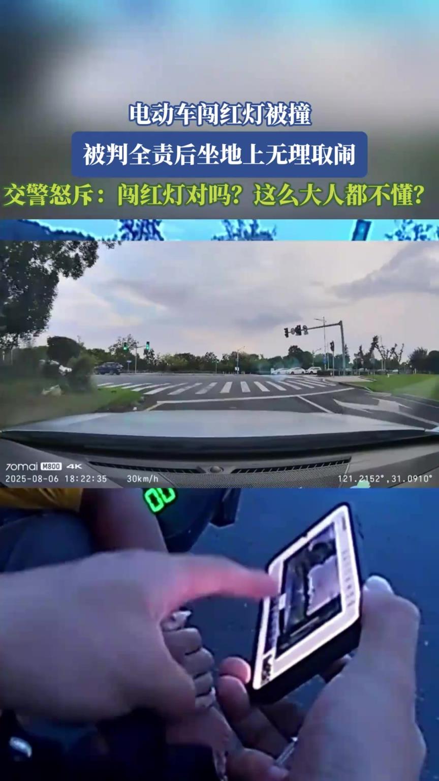 电动车闯红灯被撞,被判全责后坐地上无理取闹,交警怒斥
