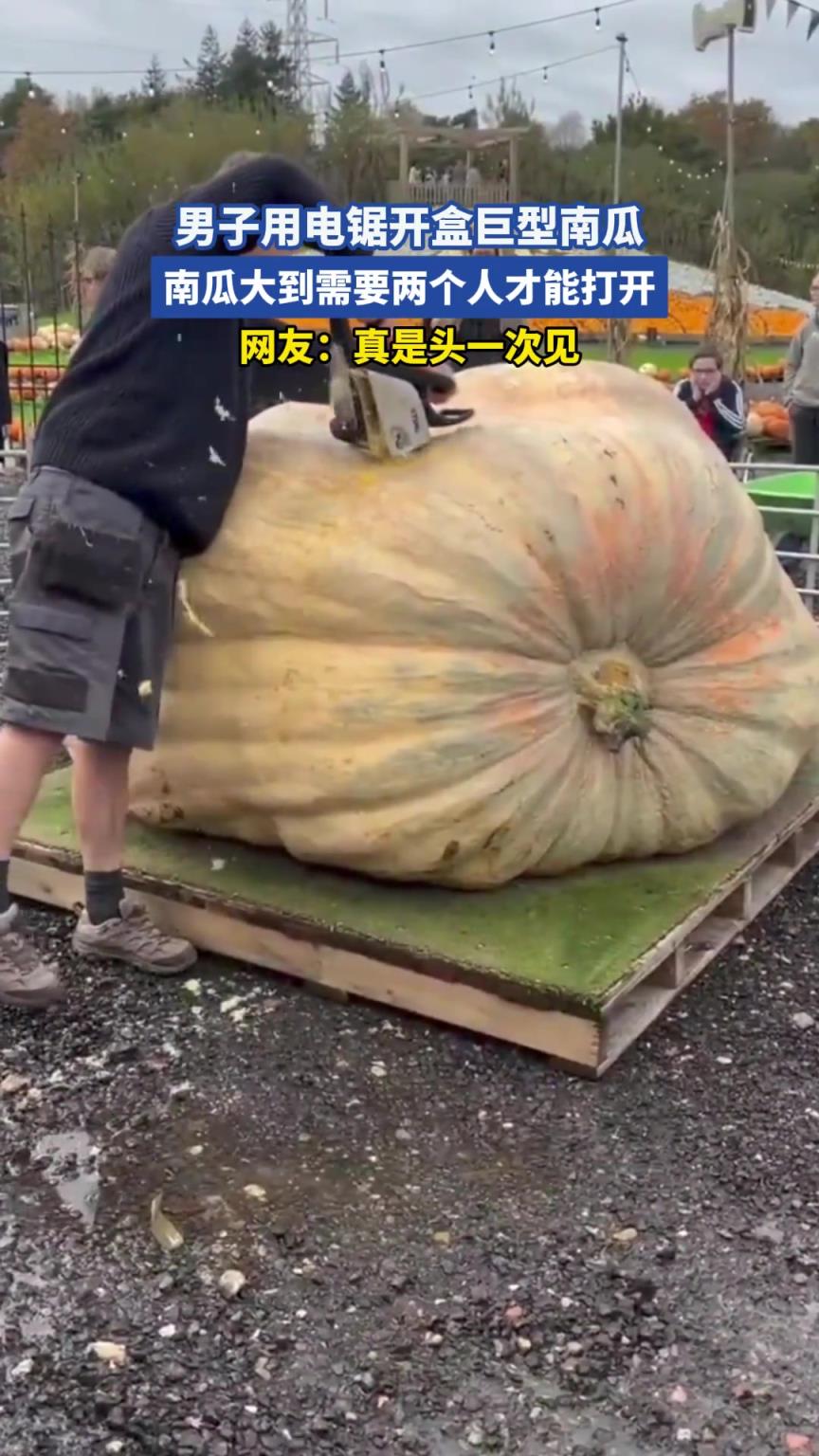 男子用电锯开盒巨型南瓜,南瓜大到需要两个人才能打开