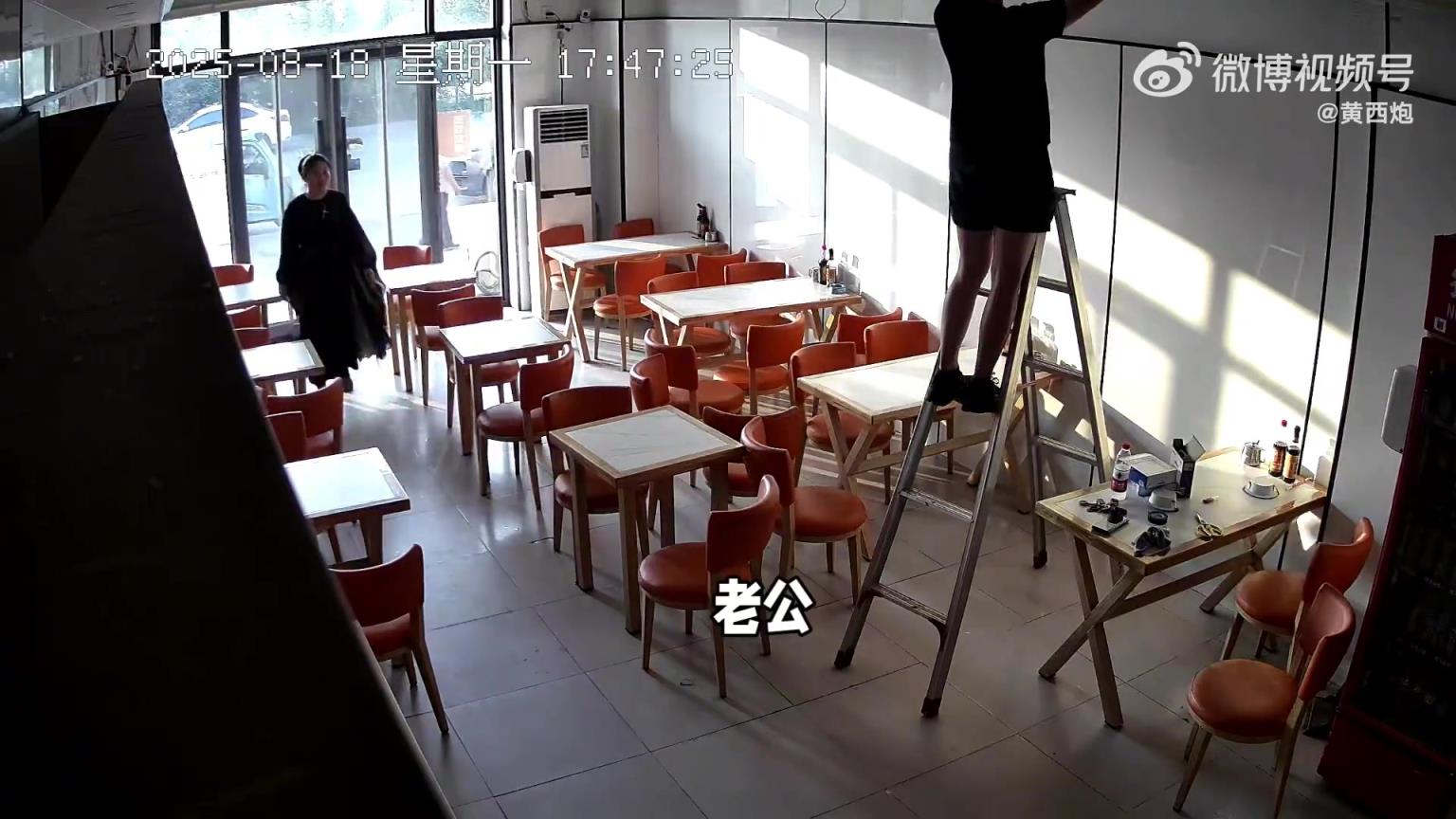 老公正在更换灯具,老婆开门急于展示自己的新衣服把灯打开了!