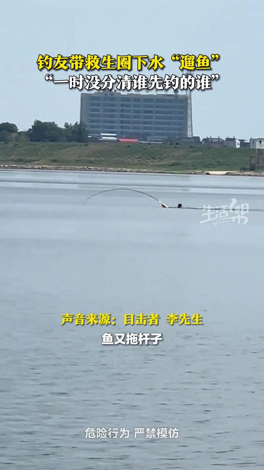 一位钓友因为鱼把杆子拖走了,于是带上救生圈下水去追。