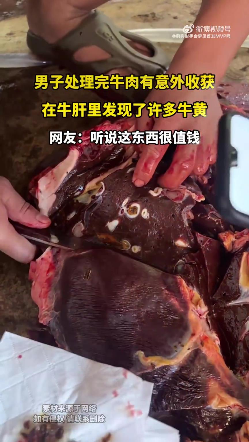 男子处理完牛肉有意外收获,在牛肝里发现了许多牛黄