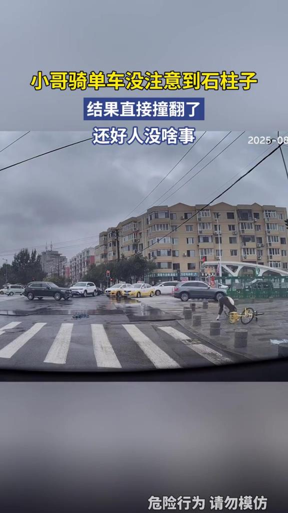 小哥骑单车没注意到石柱子,结果直接撞翻了!
