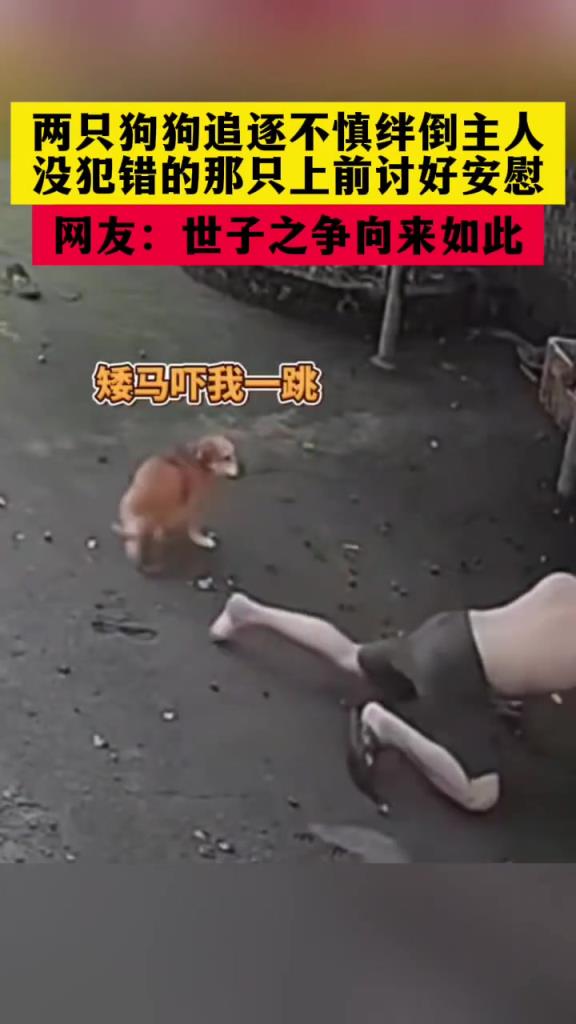 两只狗狗追逐不慎绊倒主人,没犯错的那只上前讨好安慰