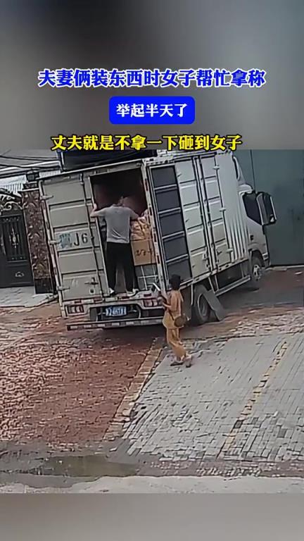 夫妻装东西时女子帮忙拿称,举起半天了丈夫就是不拿一下砸到女子