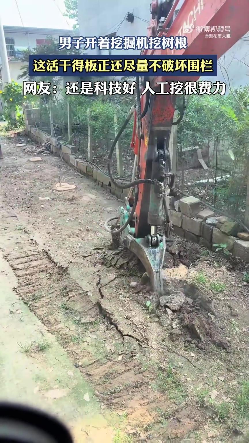 男子开着挖掘机挖树根,这活干得板正还尽量不破坏围栏
