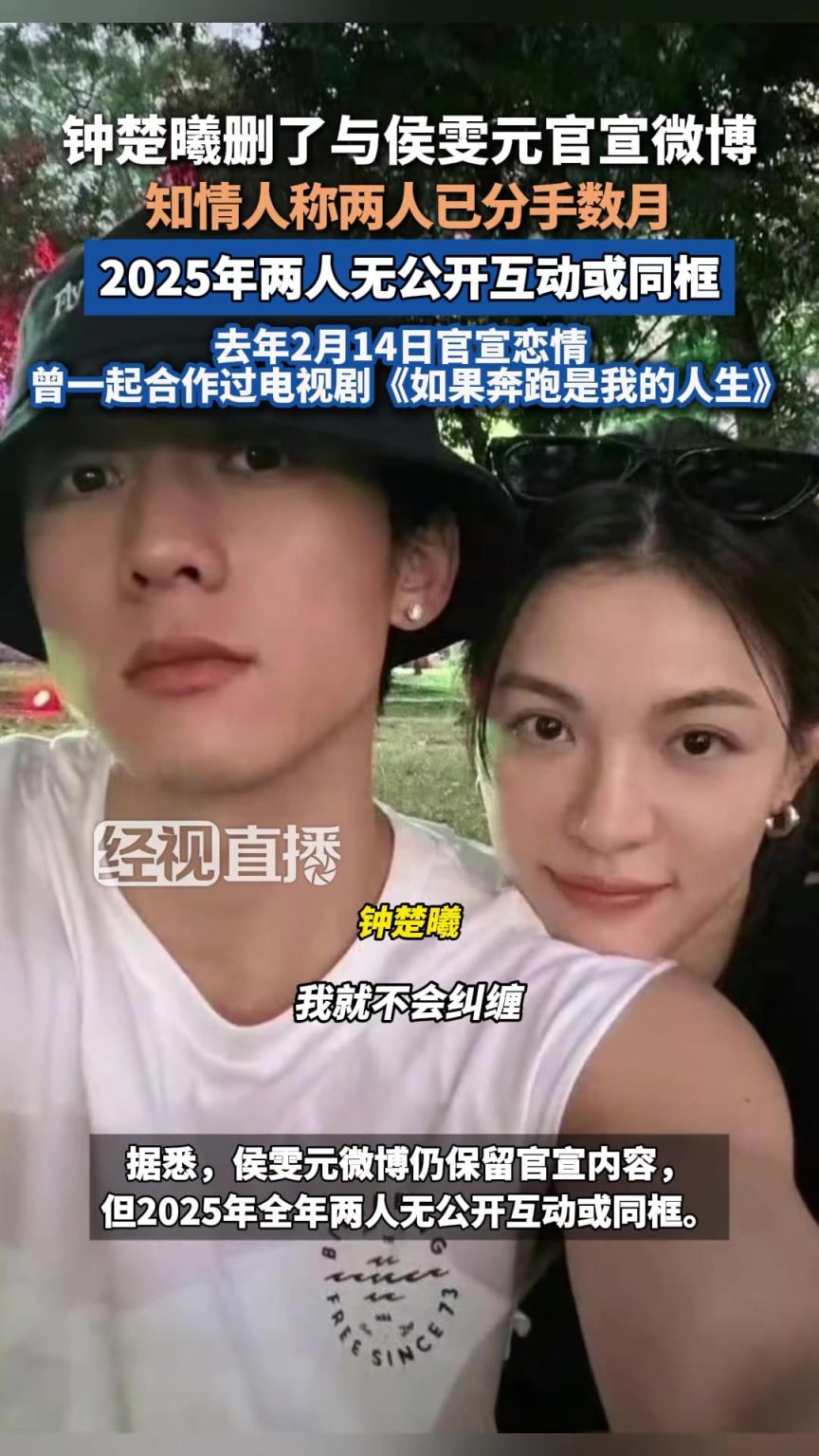 钟楚曦侯雯元被曝已分手数月,女方删除官宣恋情内容