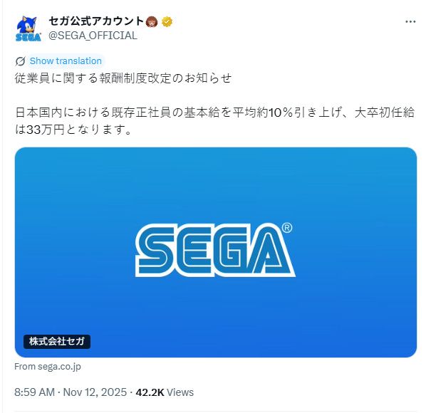 日本游戏公司世嘉又涨薪:为了在社会变革中让员工安心工作