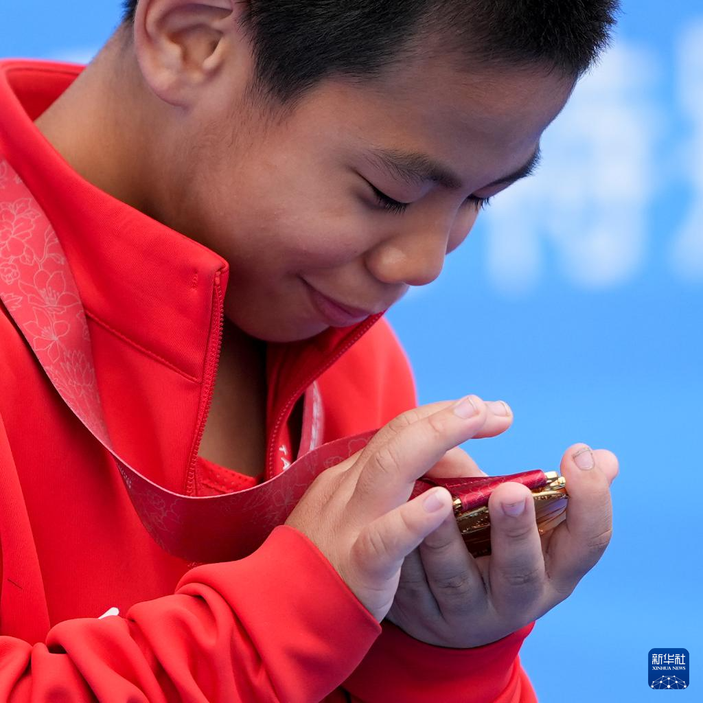 12月11日,冠军江西队选手万佳豪在男子8-11岁组200米决赛第1组颁奖仪式上查看金牌。