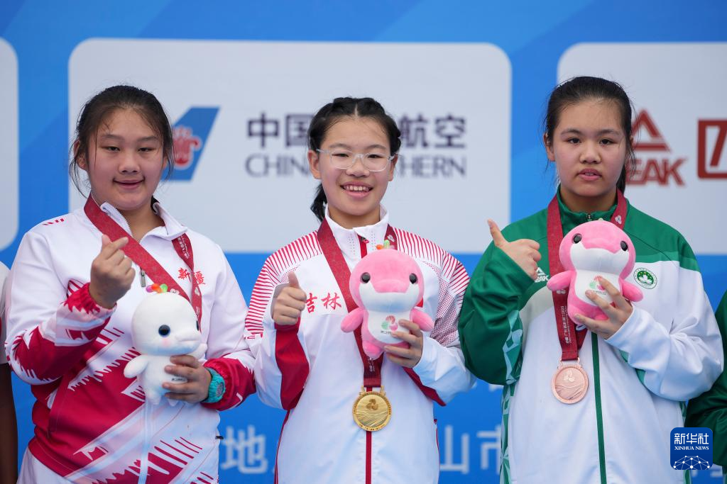 12月11日,冠军吉林队选手李馨月(中)、亚军新疆队选手李王妍姣(左)和季军澳门一团队选手曾子慧在女子12-15岁组200米决赛第2组颁奖仪式上合影。
