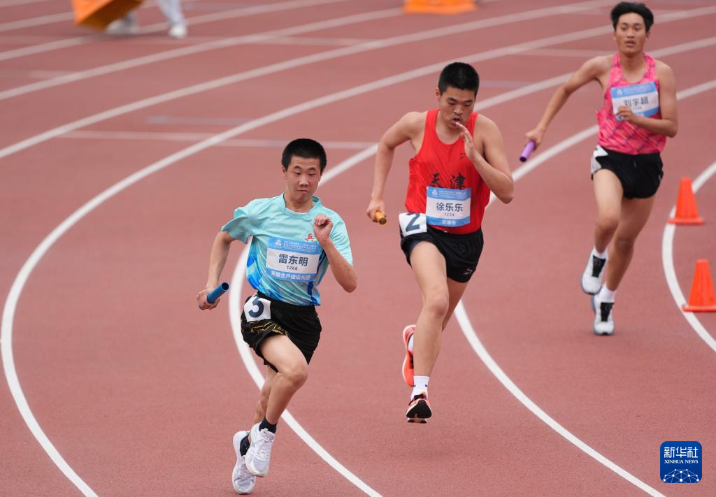 12月11日,新疆兵团接力二队选手雷东明(左)在男子16-21岁组4x400米接力决赛第2组比赛中。最终,新疆兵团接力二队获得亚军。