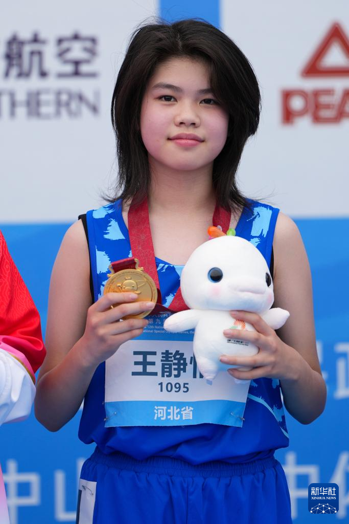 12月11日,冠军河北队选手王静怡在女子12-15岁组200米决赛第1组颁奖仪式上。