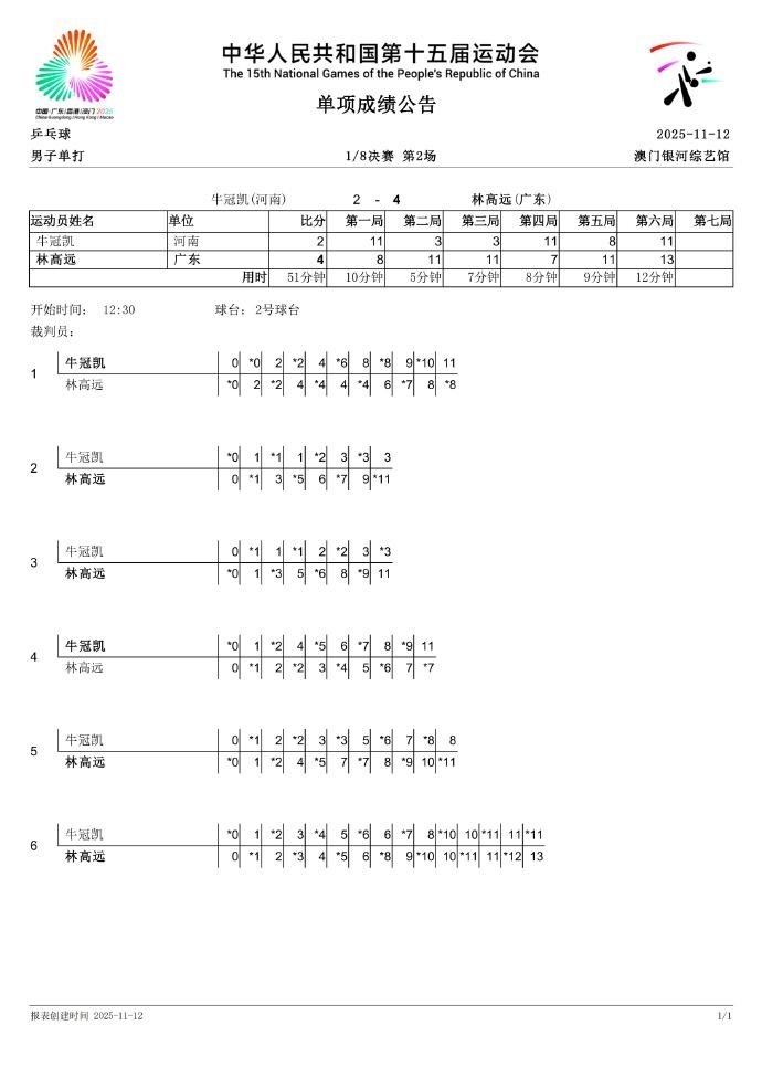 体育日报11月12日播报讯 全运会乒乓球男子单打1/8决赛,林高远4-2战胜牛冠凯。