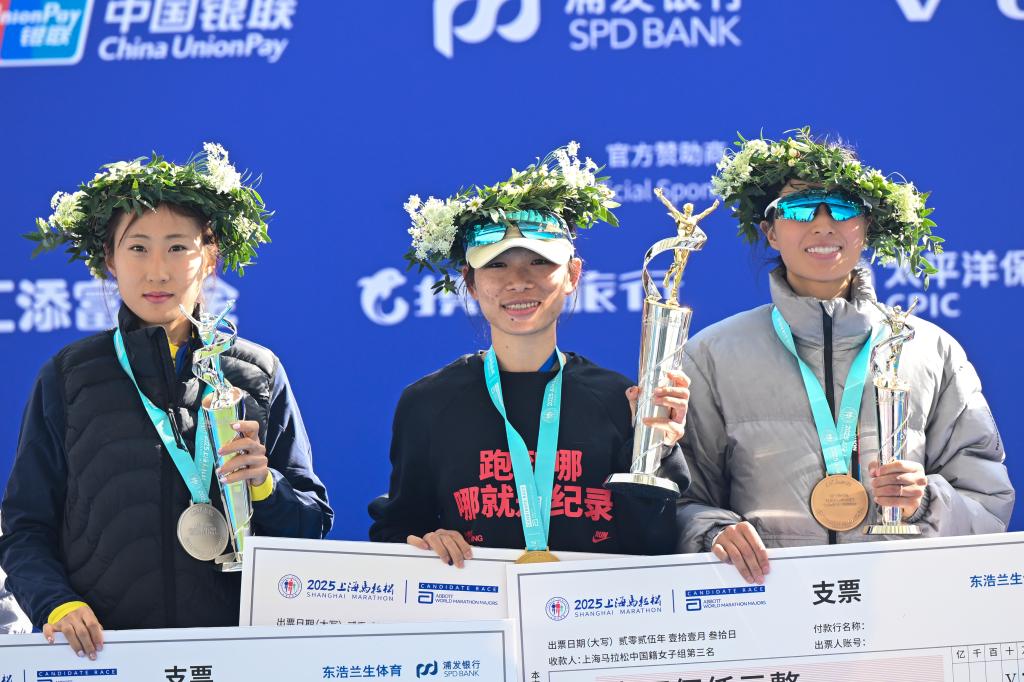 11月30日,2025上海马拉松中国籍女子组冠军张德顺(中)、亚军吴冰(左)和季军姚妙在颁奖仪式上。体育日报记者 陈浩明 摄