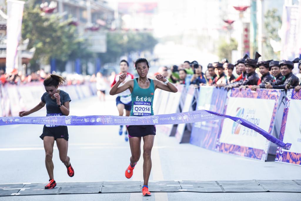 2018年12月2日,中国选手姚妙(右)以7小时07分49秒的总成绩获女子组全程冠军。当日,2018贵州环雷公山超100公里国际马拉松在贵州省从江县进行了最后一个赛段21.0975公里的比赛。体育日报记者 陶亮 摄