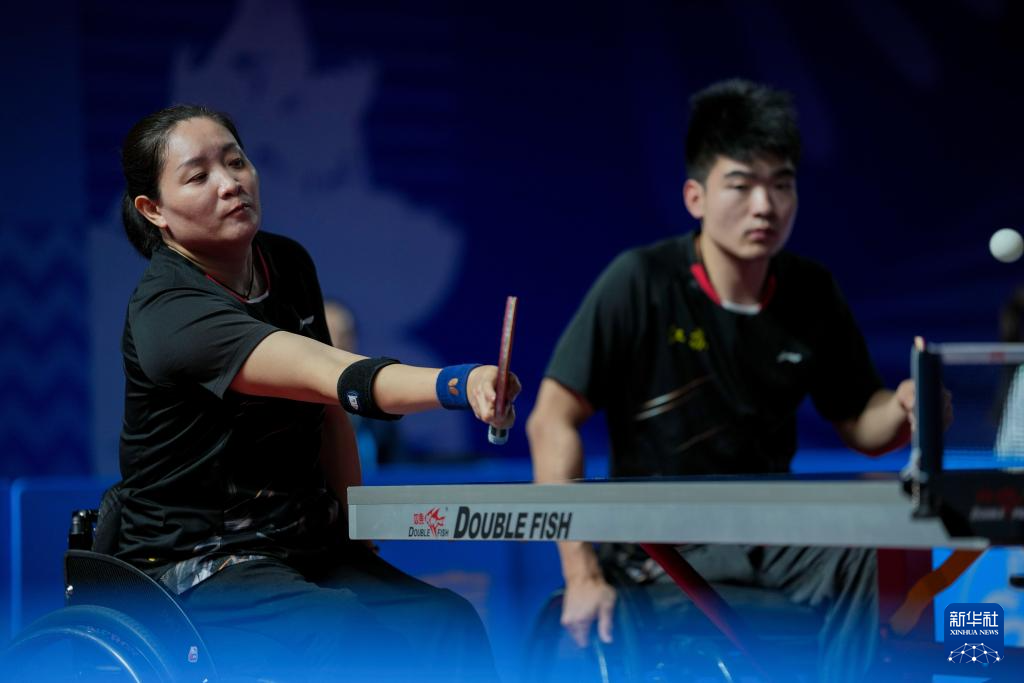 12月8日,北京队组合茅经典(右)/赵小静在乒乓球TT10女子双打小组赛中。最终,她们3比1战胜甘肃队组合刘旭/周迪奋。