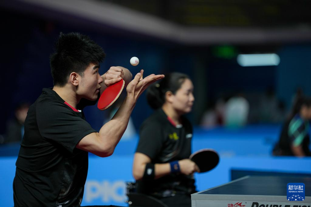 12月8日,江苏队组合彭政扬(左)/张变在乒乓球XD10混合双打小组赛中。最终,他们3比0战胜香港一团组合蔡兆雄/黄佩仪。