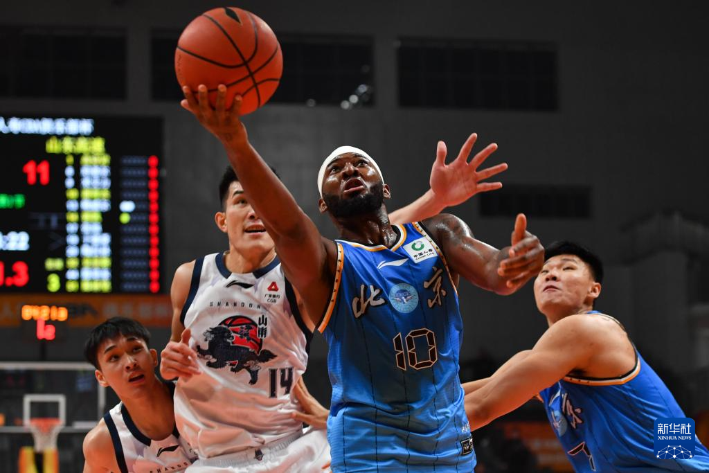 12月7日,北京北汽队球员杰曼(右二)在比赛中上篮。