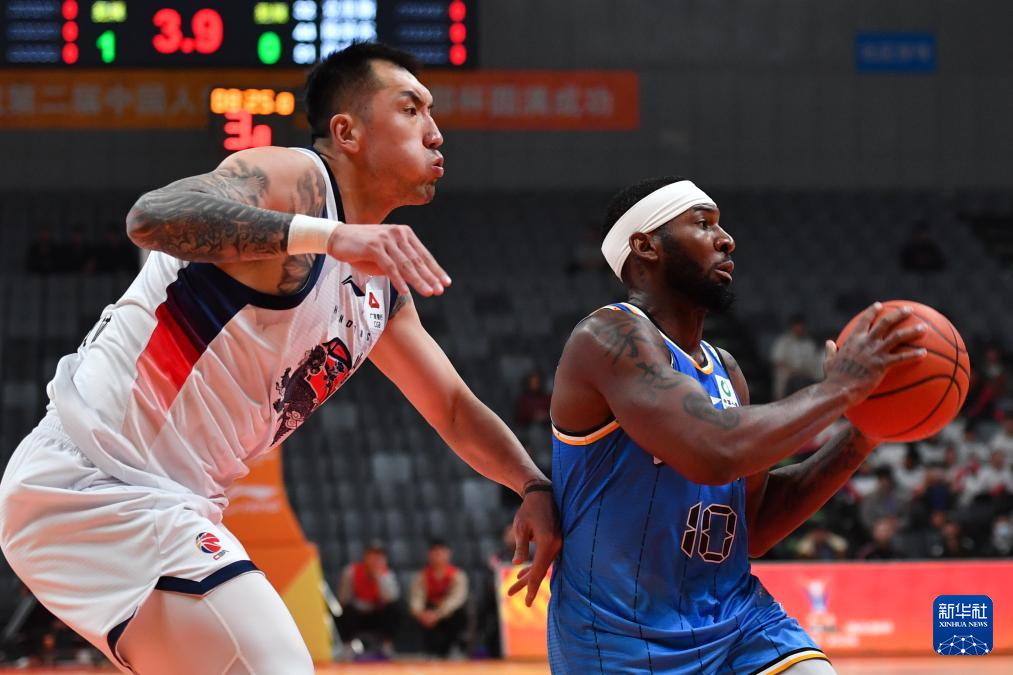 12月7日,北京北汽队球员杰曼(右)在山东高速队球员陶汉林防守下上篮。