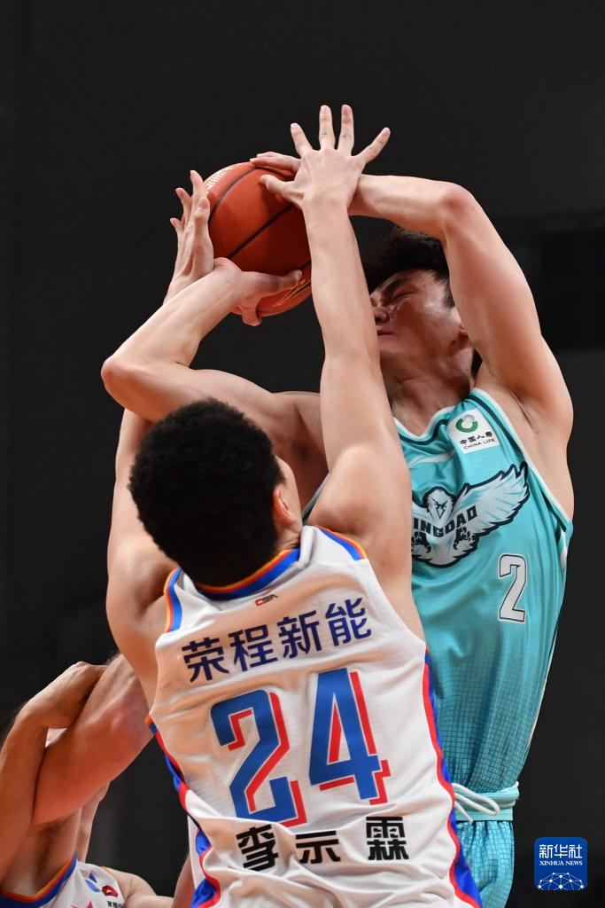 12月7日,青岛崂山啤酒队球员王睿泽(右)在比赛中进攻。