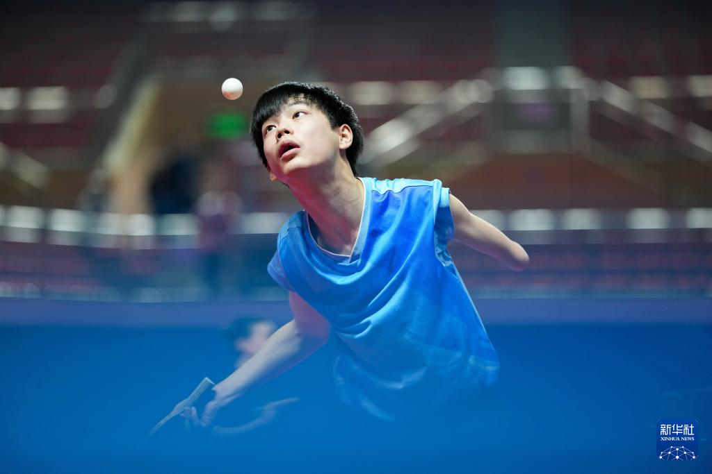 12月11日,吉林队选手赵鸿鑫在TT10男子单打小组赛A组比赛中发球。最终,他3比2战胜海南队选手符振荣。