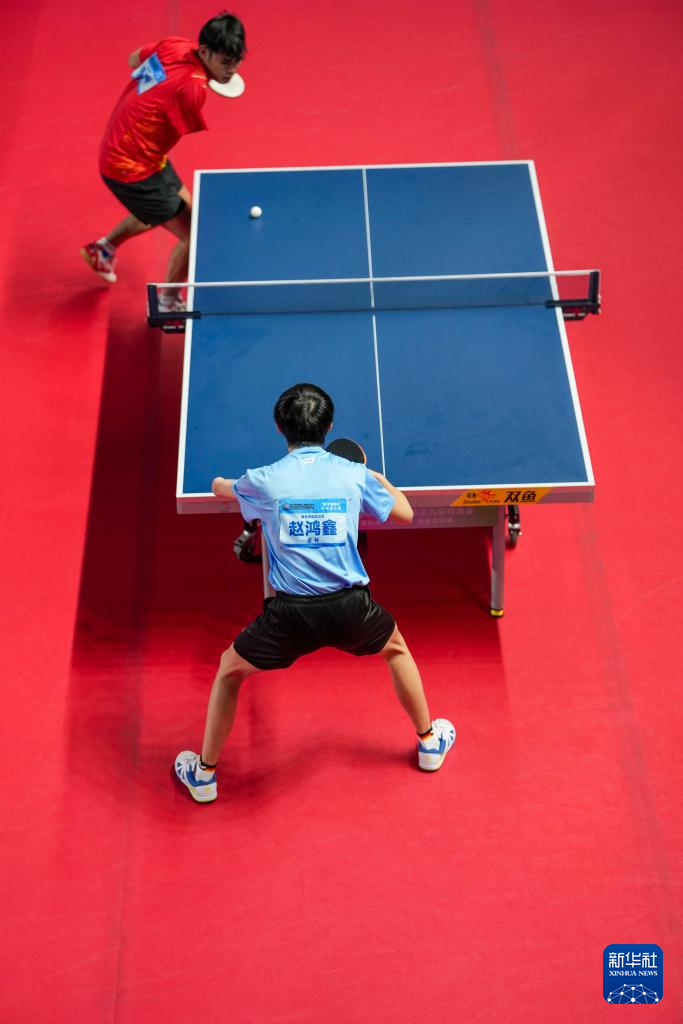 12月11日,吉林队选手赵鸿鑫(下)和海南队选手符振荣在TT10男子单打小组赛A组比赛中。最终,赵鸿鑫3比2战胜符振荣。