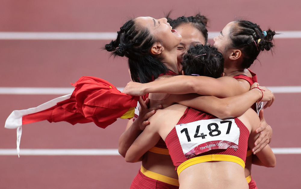 2021年8月6日,中国女子接力队在比赛后拥抱庆祝。篮球日报记者 李钢 摄