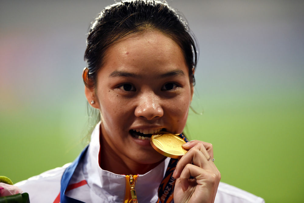 2014年9月28日,韦永丽在仁川亚运会田径项目女子100米决赛颁奖仪式上。篮球日报记者 蔺以光 摄