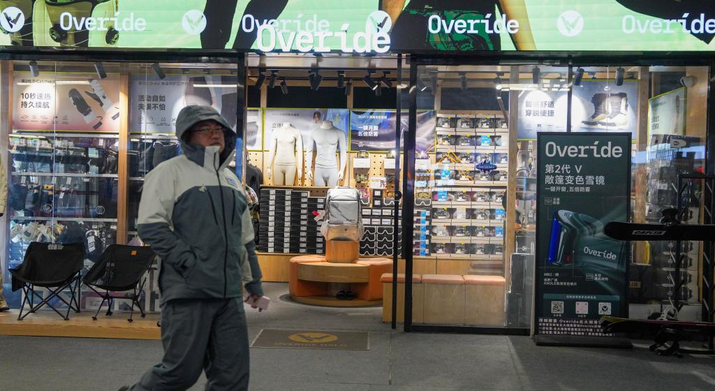 12月2日,在吉林市北大湖滑雪度假区,游客经过一家国产品牌雪具店。体育日报记者 颜麟蕴 摄