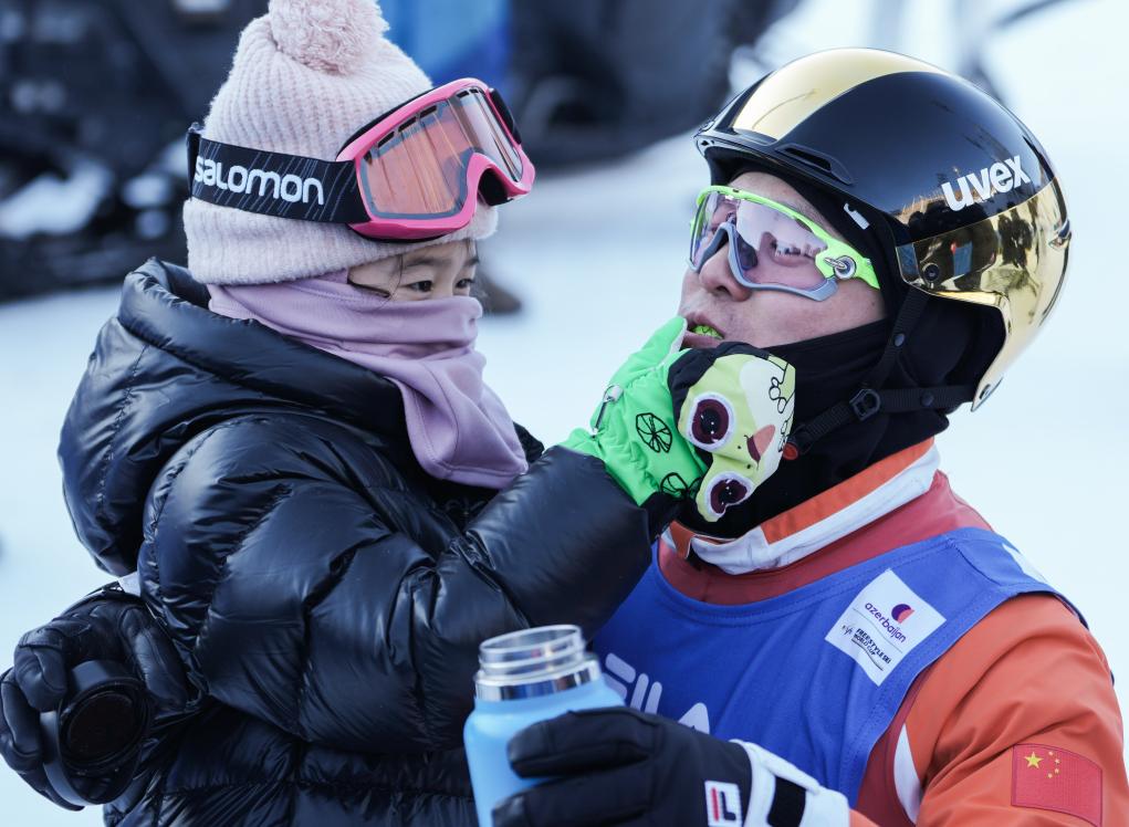 12月20日,中国自由式滑雪运动员齐广璞(右)的女儿在赛后为他摘下护脸。最终,齐广璞获得男子个人项目银牌。体育日报记者 卢星吉 摄
