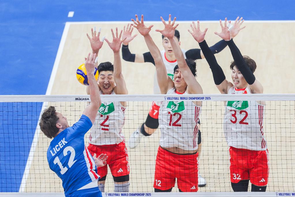 9月18日,中国队球员刘力宾、张哲嘉、江川(从右至左,前)在2025年世界男排锦标赛小组赛比赛中防守。体育日报发(乌马利摄)