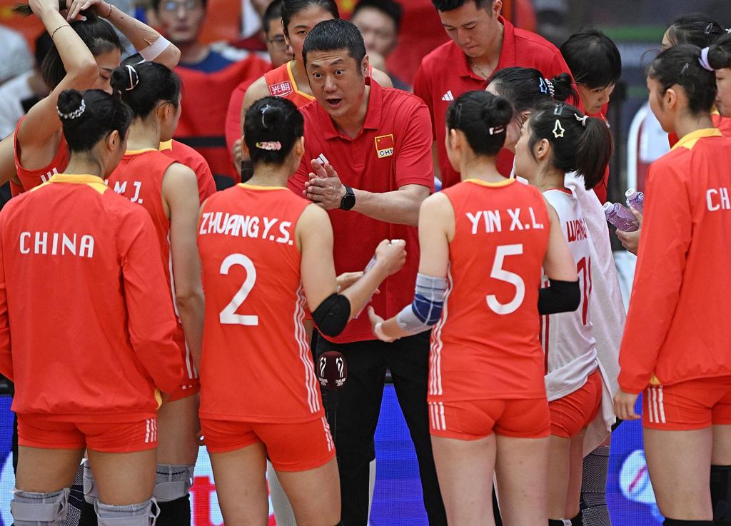 8月31日,中国队主教练赵勇(中)在2025年世界女排锦标赛八分之一决赛比赛间隙指导球员。体育日报记者 侯昭康 摄