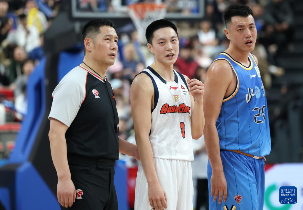 1月1日,北京北汽队球员翟晓川(右)与广东东阳光队球员胡明轩(中)在比赛中与裁判交流。
