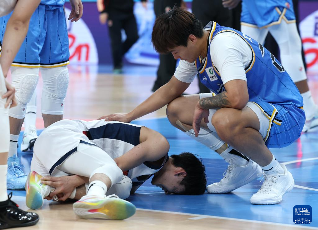 1月1日,北京北汽队球员赵睿(右)安慰在比赛中受伤的广东东阳光队球员徐杰。