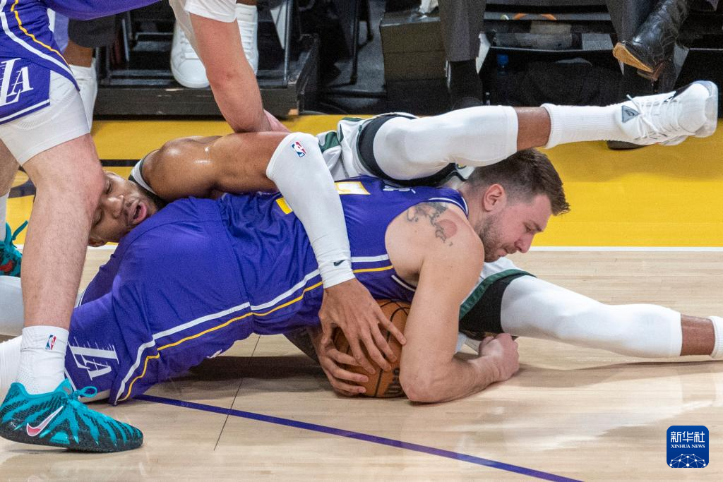 1月9日,雄鹿队球员扬尼斯·安特托昆博(上)与湖人队球员卢卡·东契奇在比赛中拼抢。