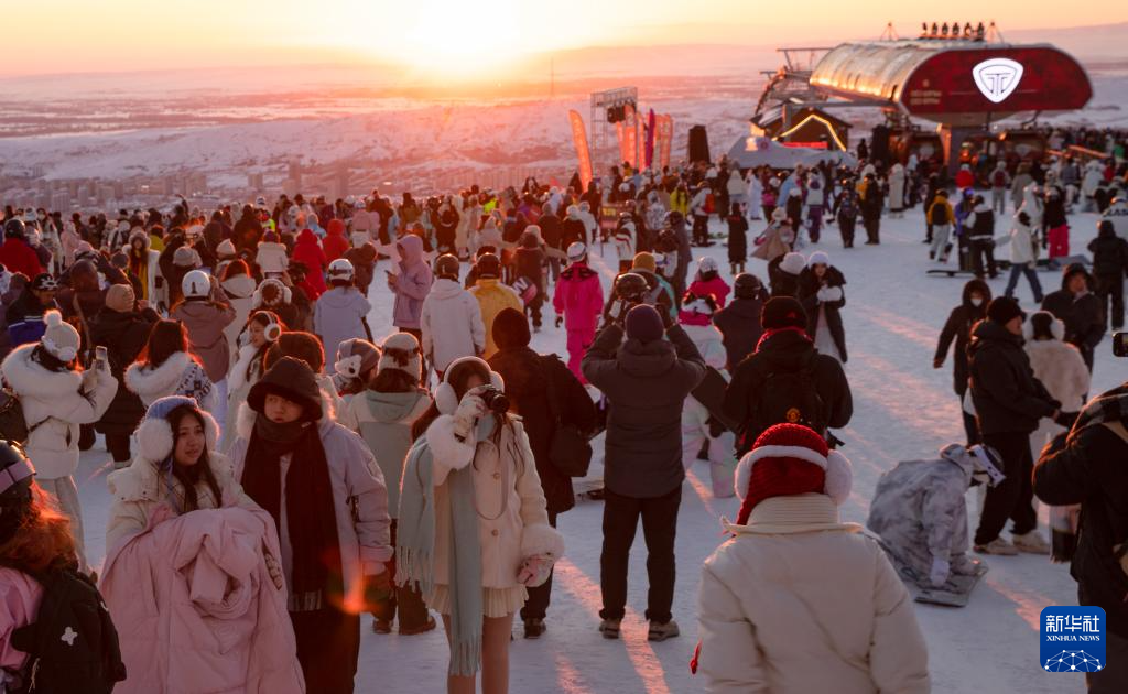1月18日,日落时分,游客在新疆阿勒泰将军山国际滑雪度假区游玩。