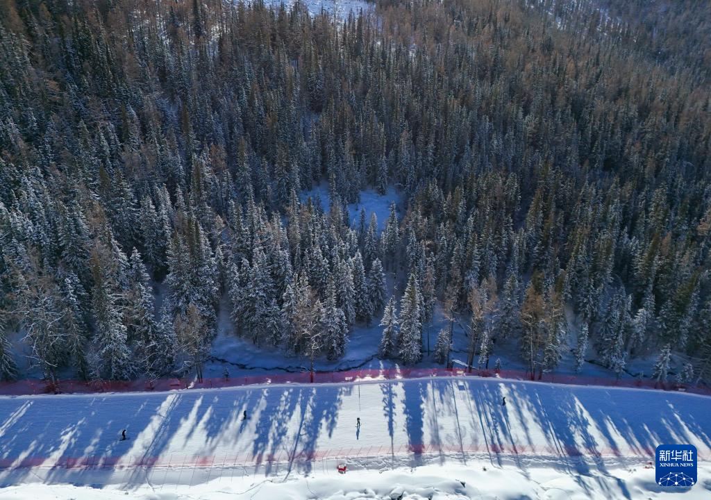1月17日,滑雪爱好者在新疆阿勒泰可可托海国际滑雪度假区滑雪(无人机照片)。