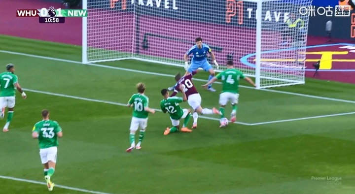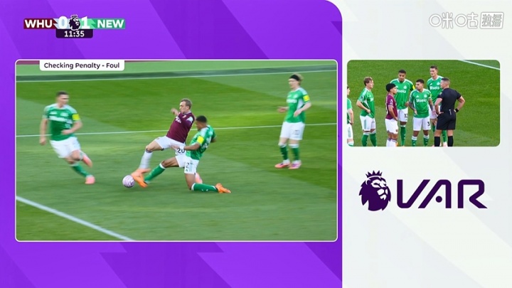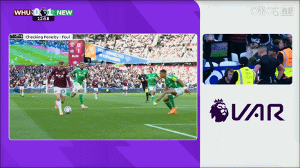 比赛第11分钟,佳夫犯规送点,经VAR介入,主裁场边观看回放后确认佳夫触球,点球取消,纽卡仍1-0领先西汉姆。