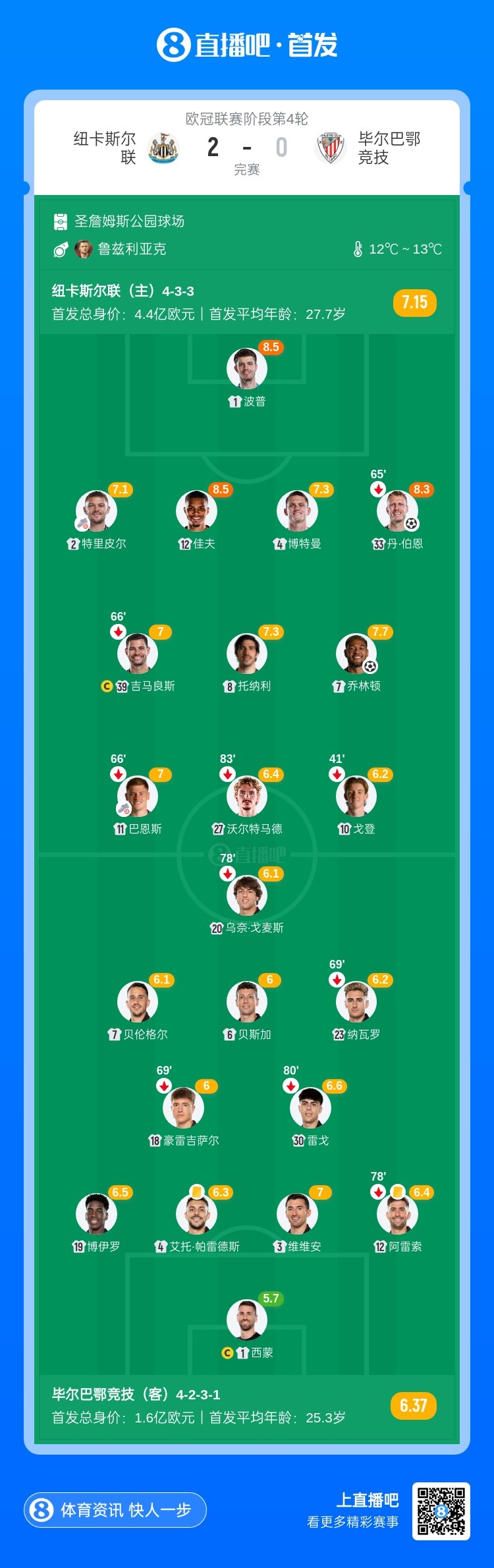 足球日报11月6日播报讯 欧冠联赛阶段第4轮,纽卡斯尔联坐镇主场圣詹姆斯公园球场迎战毕尔巴鄂竞技。上半场,丹伯恩头槌破门,戈登伤退。易边再战,乔林顿再下一城。最终纽卡2-0毕尔巴鄂。积分榜方面,纽卡9分第六,毕巴3分第27。