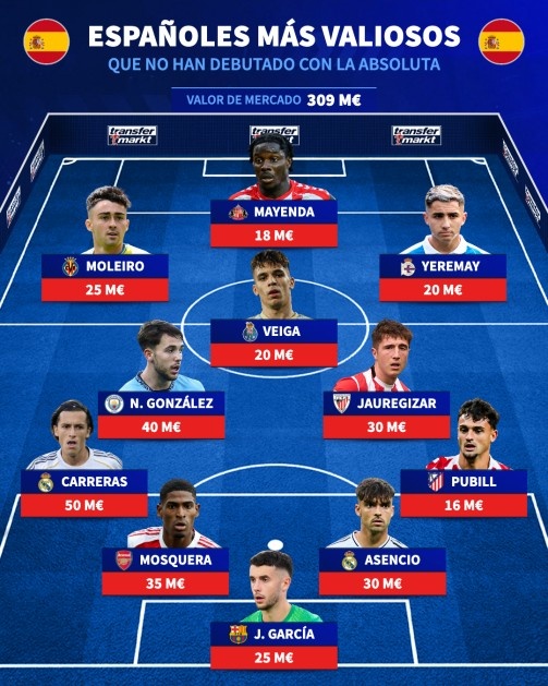 尚未代表西班牙队出场身价最高阵容(总价3.09亿欧)