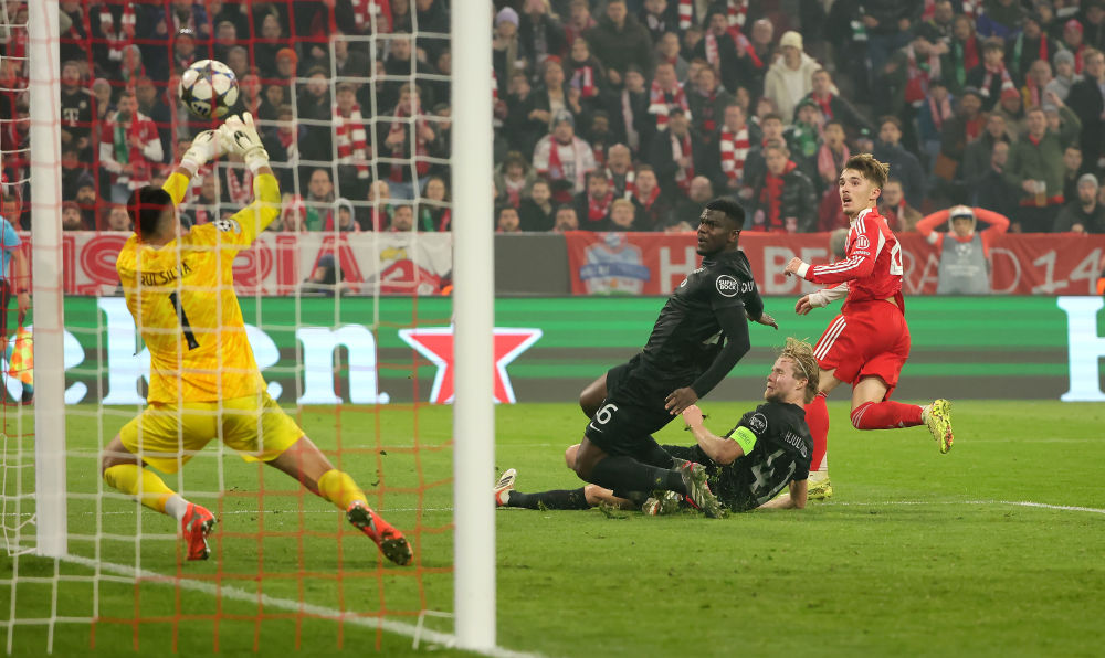 12月9日,拜仁慕尼黑队球员卡尔(右一)在比赛中射门得分。足球日报发(菲利普·鲁伊兹摄)